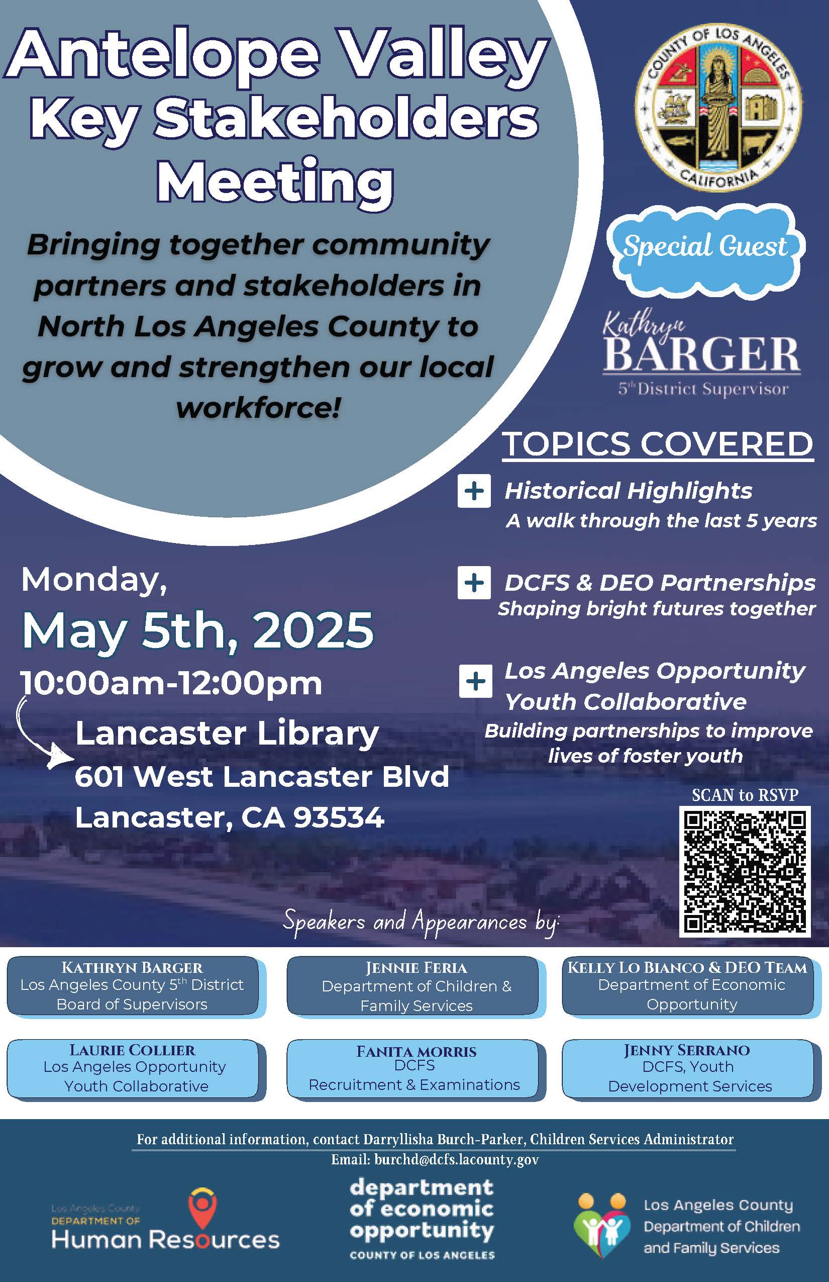 We look forward to continuing the conversation and invite you to join Supervisor Kathryn Barger at her upcoming Antelope Valley event on May 5, 2025. Speakers and appearances will include LA County Supervisor Kathryn Barger, Chief Deputy Director of the Department of Children and Family Services, Jennie Feria, and the Director of the Department of Economic Opportunity, Kelly LoBianco.